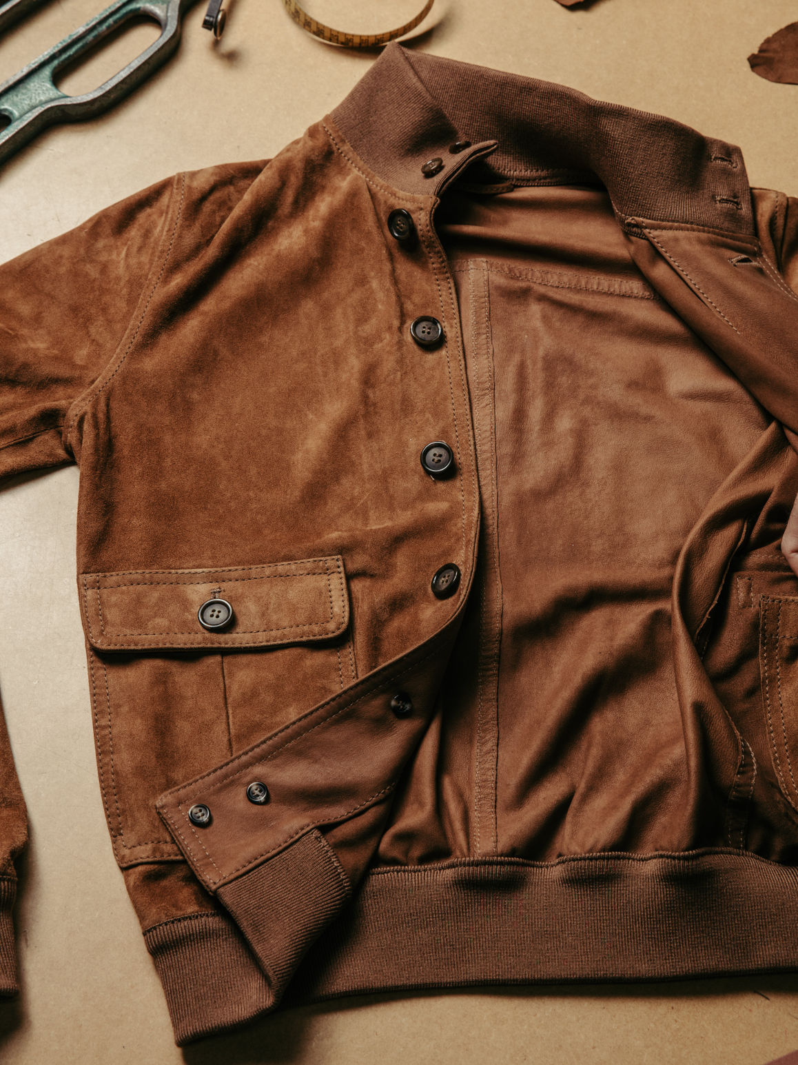 Una delle fasi più delicate nella realizzazione del Valstarino è la cucitura del camoscio sul bordo a costine di collo, polsini e orlo. Essendo un materiale elastico e ricco di “molla”, va distribuito con precisione perfetta: né troppo lasco, né troppo tirato, per evitare indesiderati arricciamenti o deformazioni.