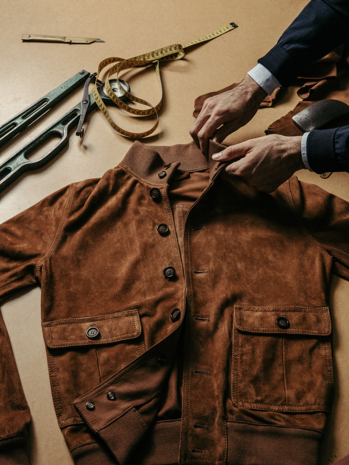 Il nostro team taglia a mano tutte le parti del Valstarino, che possono arrivare fino a 20 elementi, inclusi i tre ampi pannelli posteriori e le tasche più piccole. Questa fase del processo può richiedere fino a 60 minuti per ogni giacca. Una volta tagliati tutti i pezzi, la squadra di sarti di Valstar procede all’assemblaggio della giacca, un lavoro che può durare fino a otto ore e che utilizza una vasta gamma di macchine e strumenti, tutti richiedenti grande esperienza e pazienza. Le parti più piccole e intricate, come le asole, vengono cucite rigorosamente a mano.